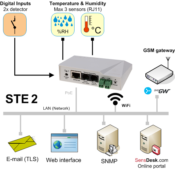 STE2 دماسنج و رطوبت سنج تحت شبکه با قابلیت پشتیبانی از پروتکل SNMP می باشد که امکان مانیتورینگ سنسورهای متصل به دستگاه را توسط نرم افزارهای مانیتورینگ SNMP نظیر Solarwinds ,The Dude ,Verax NMS ,Zabbix ,Zenoss ,Nagios ,OpenNMS ,Op5 ,opmanager و ... فراهم می سازد.