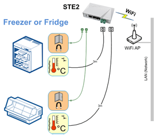 تا چهار سنسور دما و یا رطوبت اکسترنال را می توان به دماسنج وای فای STE2 متصل نمود. دو ورودی دیجیتال با پورتهای سبز رنگ را می توان برای اتصال به انواع سنسورها نظیر سنسور درب، دود و آتش، دتکتور برق، نشتی مایعات و ... مورد استفاده قرار داد.