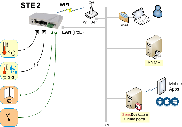 - STE2 می تواند به عنوان یک سنسور دما رطوبت تحت WIFI جهت مانیتورینگ از را ه دور دما و رطوبت اتاق سرور و یا تاسیسات مورد استفاده قرار بگیرد.
